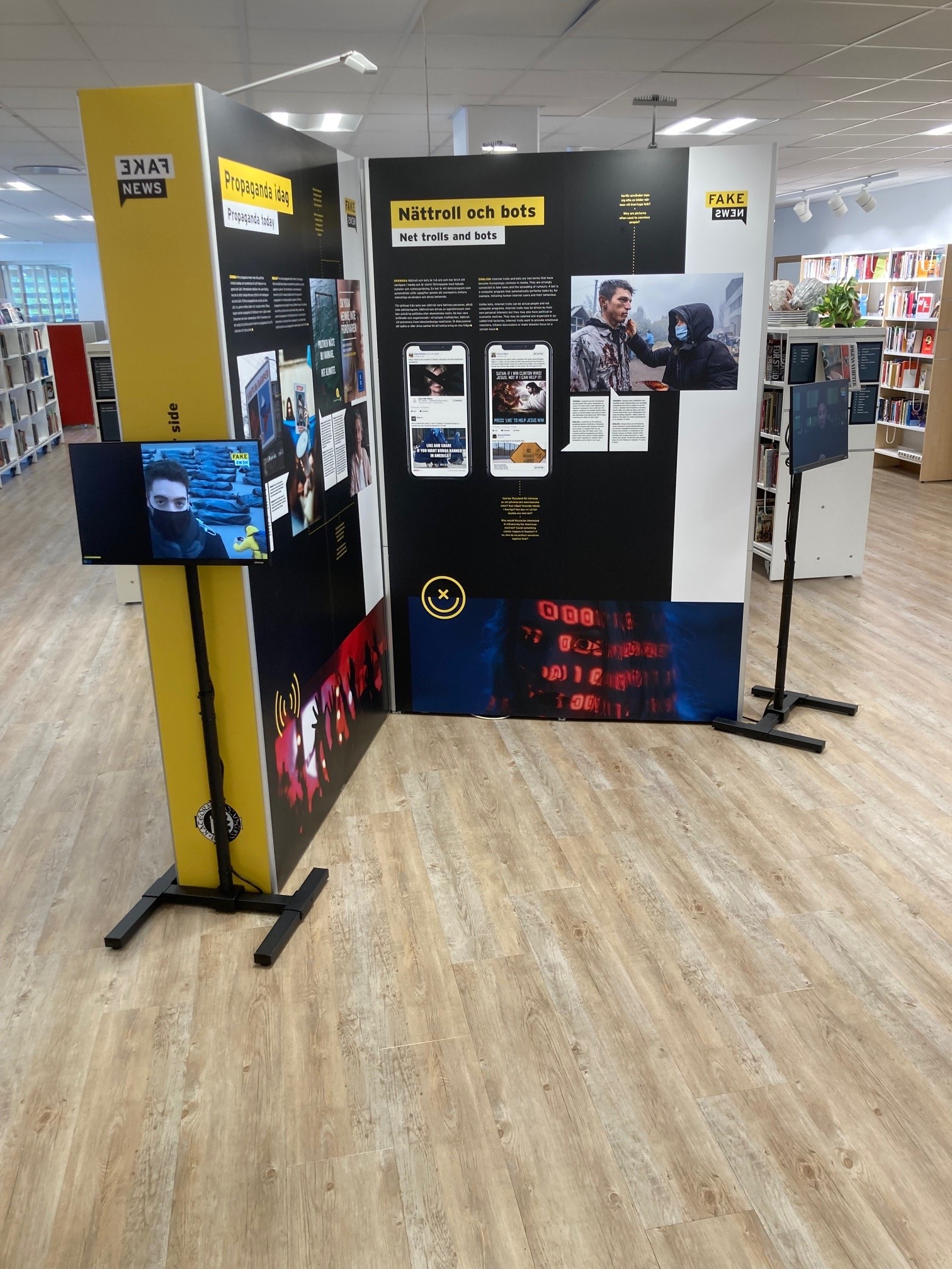 Utställningen Fake news – spelar sanningen någon roll? handlar om desinformation i olika former. Här presenteras flera exempel på bland annat post-truth politics, propaganda, fejkade nyheter och deepfake. Utställningen består av väggmoduler som enkelt kan sättas upp och kombineras på olika sätt. Till modulerna finns även tre monitorer med rullande bildspel och filmer. Bilden visar enbart en del av utställningen.